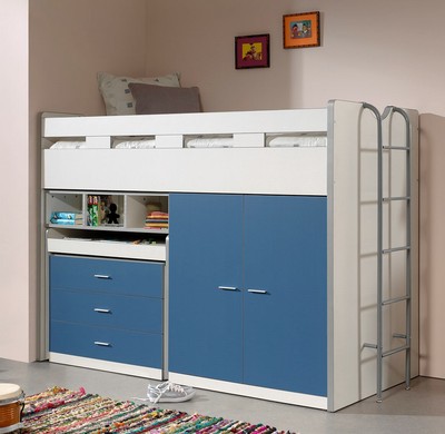 Funktionsbett mit ausziehbarem schreibtisch leiter mittig. Hier hast du schreibtisch bett und regal in einem.