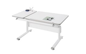 Dieses durchdachte schreibtisch modell das individuell auf die erfordernisse von schülern eingeht. Die tischplatte gibt es in herrlichem kreideweiß oder in heller birke. Das gestell ist vor schmutz geschützt durch die angebrachten silbergrauen protektoren.